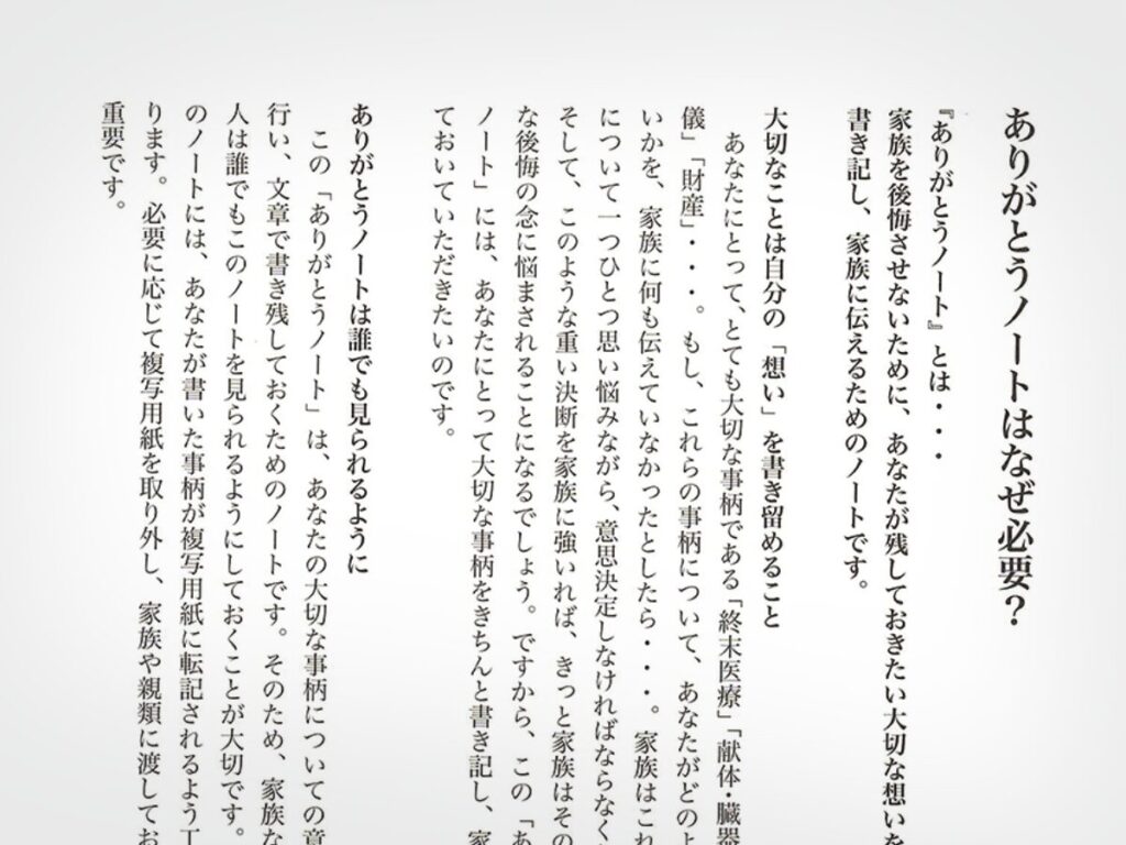 「ありがとうノート®︎」「こころがけ帖®︎」この2冊のノートは、「迷惑をかけない」「本人の意思決定が必要な内容」という前提にたって制作しています。終活のみならず、誰もが年齢関係なく、整理するために最低限必要なツールとしてご利用いただければ幸いです。