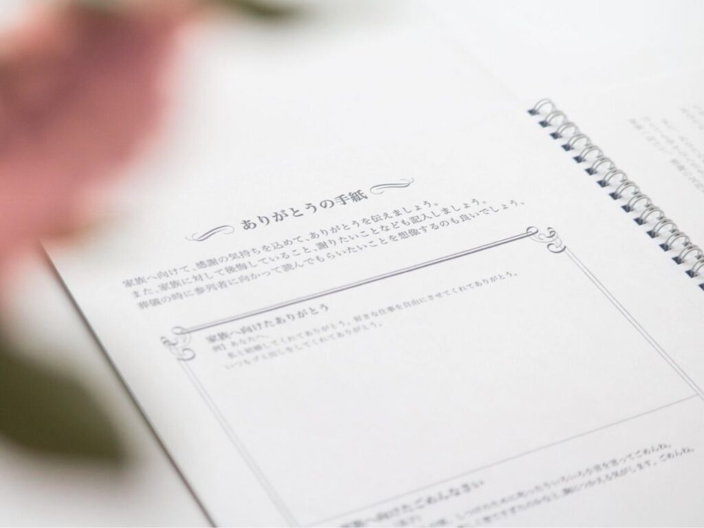 家族への想いを伝える手紙になっています。最初に「ありがとうの手紙」で家族へのありがとう・ごめんなさいの気持ちを書くことができます。
