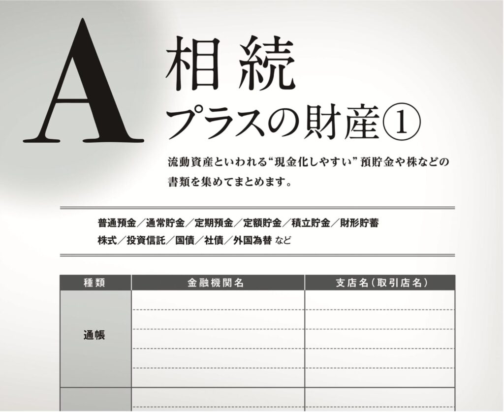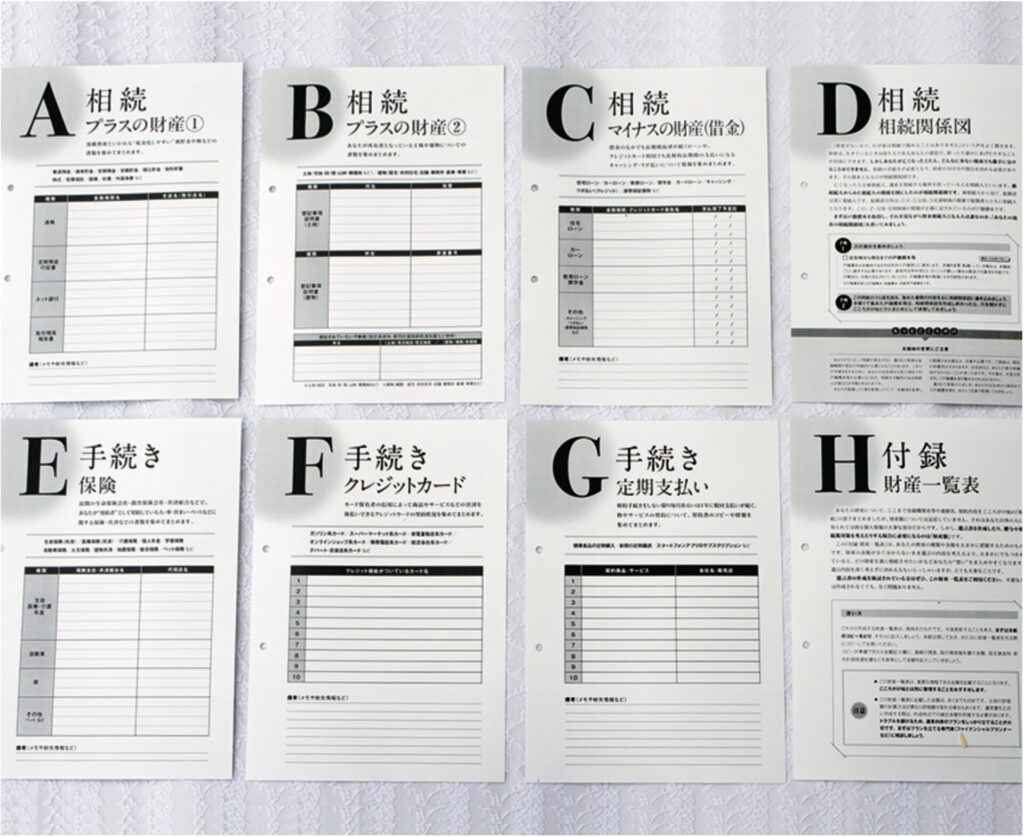 財産や契約に関する情報をA~Hの項目に分類。あちこちに散らばっている情報を一覧表にまとめていきます。