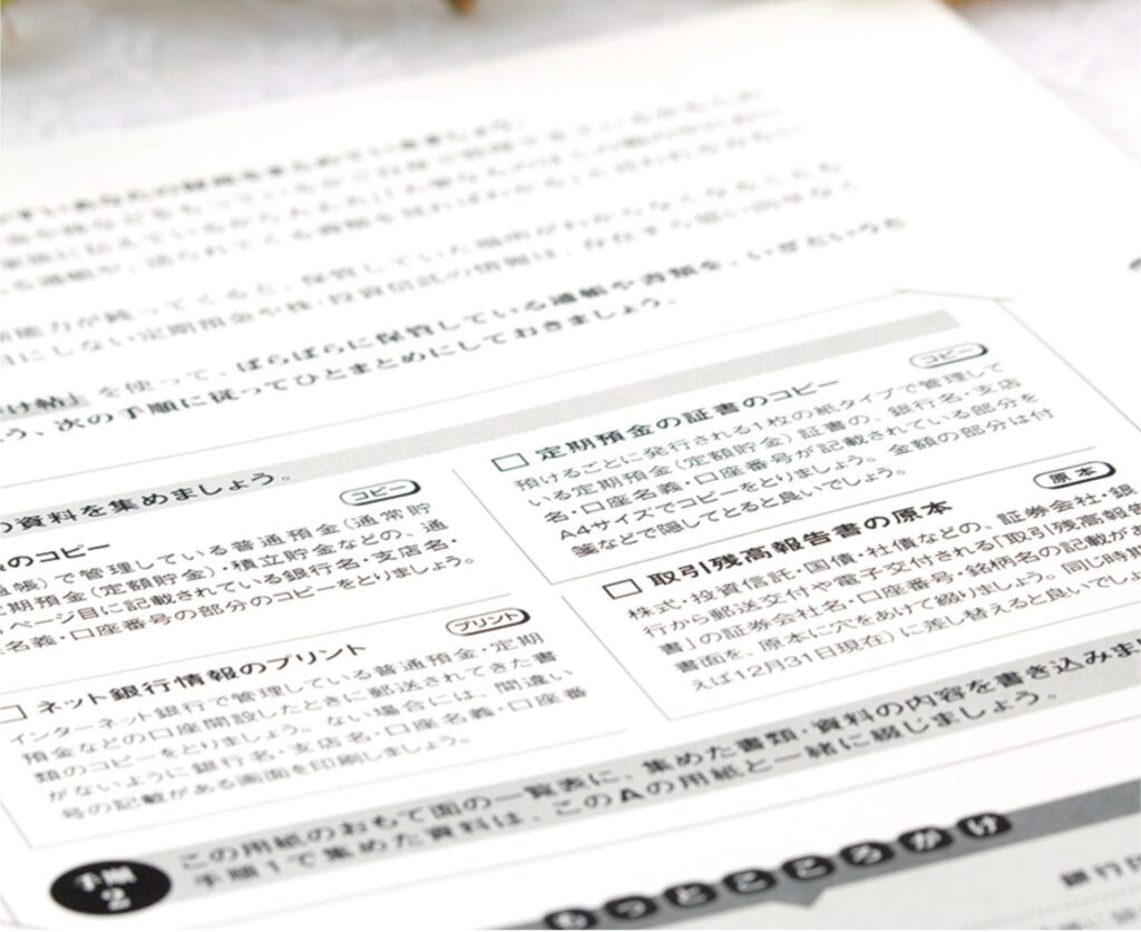 あちこちに散らばっている財産や契約に関する書類を集めてコピーを綴じ、あなたのオリジナル資料集を作ります。整理する過程で、不要なものの処分を検討することができます。誰が見てもわかりやすく整理することができ、遺言書作成にも役立ちます。